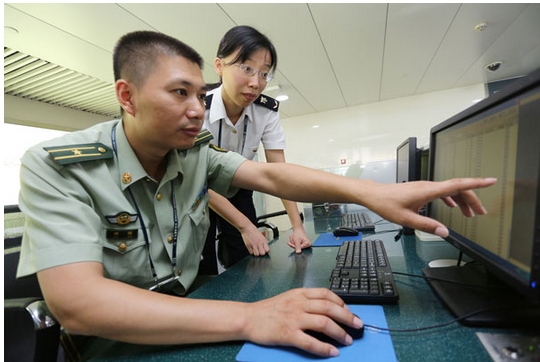 La policía fronteriza observa la pantalla del ordenador el 11 de agosto de 2014. En China se ha fortalecido el control fronterizo por el brote del ébola en áfrica occidental que amenaza al mundo. [Fotografía porXie Hao/Aisanewsphoto]