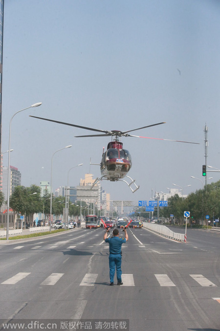 Un controlador de tránsito aéreo da indicaciones para el aterrizaje de un helicóptero que transporta un paciente que sufre de un ataque al corazón. El paciente fue trasladado de urgencia al Hospital Anzhen en Beijing. Beijing, 14 de agosto de 2014. [Foto / IC]