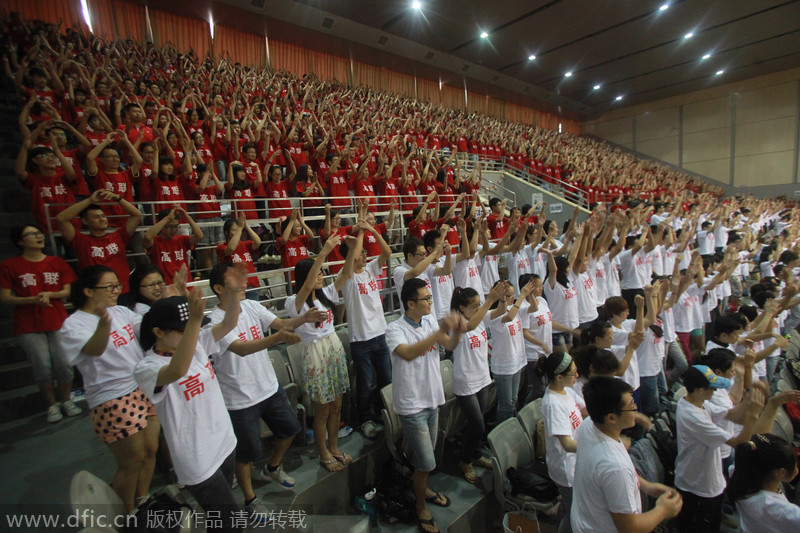 En un gimnasio de Jinan, en Shandong, cerca de 4.500 estudiantes universitarios realizan una danza de grupo con la canción pop china Little Apple. El evento se registró como el baile masivo más grande de esta canción en el país. Little Apple se ha convertido en un suceso musical en China, similar a Gangnam Style de Psy, la estrella de Corea del Sur. [foto / IC]