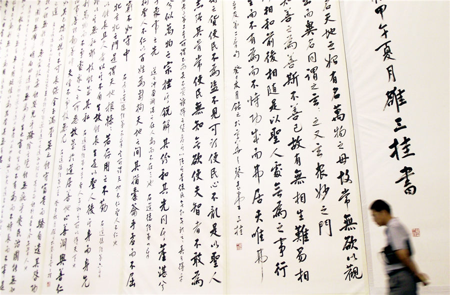 La caligrafía, de 10 metros de altura y más de 100 metros de largo, fue ealizada por el famoso calígrafo Luo Sangui. Es exhibida durante los Juegos Olímpicos de la Juventud Nanjing 2014. El Tao Te Ching (Clásico de la Virtud) es el libro de principal del taoísmo. Fue escrito por Lao Tze, hace más de 2000 a?os. El volumen desarrolla variados temas que van desde el asesoramiento en política hasta cuestiones prácticas cotidianas. El Tao Te Ching (Clásico de la Virtud) es una de los pilares de la filosofía china. [Foto: Wang Qiming / Asianewsphoto]