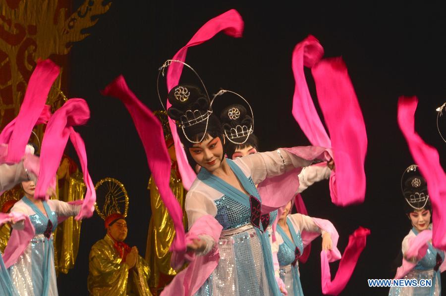 La ópera "La Diosa del Cielo regala flores" en el Lincoln Center de Nueva York, Estados Unidos. El homenaje al 120 aniversario del natalicio de Mei Lanfang fue dirigido por su hijo Mei Baojiu. Mei Lanfang nació en 1894. Cantante y director de ópera tradicional china. Su carrera se desarrolló en la época de oro de la ópera de Pekín. 20 de agosto de 2014.