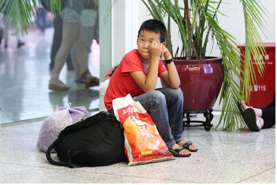 Un ni?o solitario se sienta en su equipaje, mientras espera el tren que lo llevará a su pueblo natal. [Foto: Xu Kangping/ Asianewsphoto]