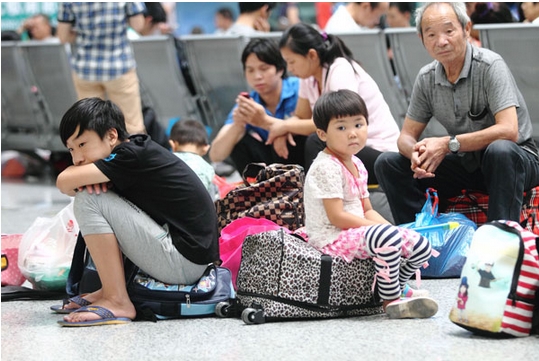Dos ni?os encuentran consuelo, mientras esperan en la estación. [Foto: Xu Kangping/ Asianewsphoto]