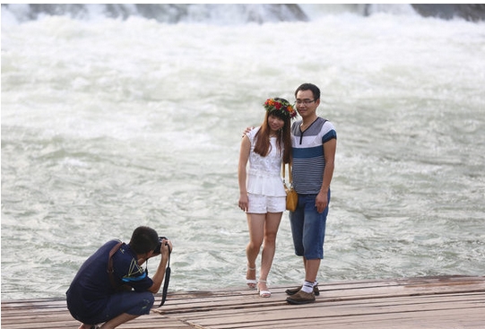 Los visitantes toman fotos en el río Tuo, en el casco antiguo de Fenghuan. [Foto/PPC]