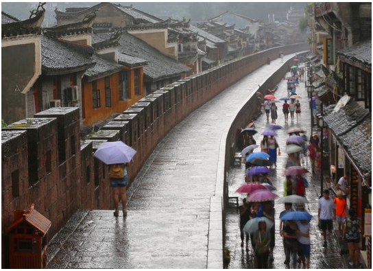 A pesar de la lluvia, los turistas pasean por el casco antiguo de Fenghuang. [Foto / PPC]