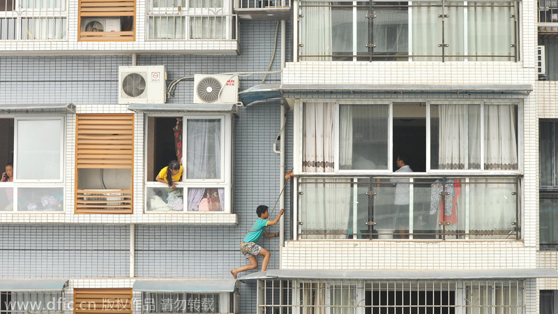 El ni?o, por miedo a ser golpeado y para evitar el castigo, se refugió en el descanso exterior de la ventana.Después de conversar con el policía, Kai acepta entrar a su casa. El apartamento está ubicado en el piso 11, en Yibin, Sichuan. [Foto: IC]