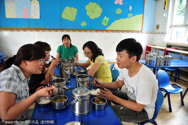 Liang conversa con sus colegas durante el almuerzo. Consulta a los maestros experimentados sobre cómo educar mejor a los ni?os. [Foto: PPC]
