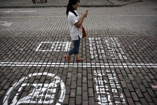 | Personas caminan por una acera que se divide en dos vías: una para los que utilizan teléfonos celulares, y la otra para los que no lo usan. Chongqing. |
