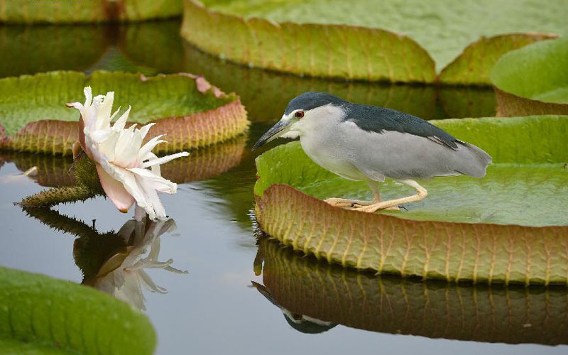 Una garza descansa sobre una hoja gigante de Victoria durante una exposición de plantas acuáticas en el Parque Shuangxi en Taipei, Taiwán.