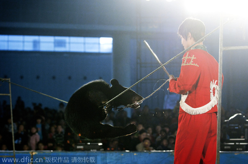 Un oso negro atado a una cuerda está suspendido en el aire durante una actuación en un zoológico de Changsha. [Foto/IC]