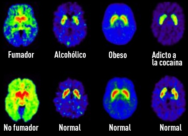 Al comparar un cerebro normal con el de un obeso o el de un adicto a la cocaína, el normal tienen mucha más cantidad de dopamina. Una sustancia química producida por el cerebro, asociada con la recompensa.