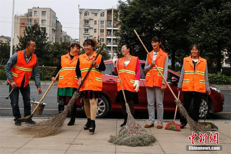 La brigada de saneamiento comunal, antiguos agricultores que entregaron sus tierras al desarrollo urbano y fueron generosamente compensados, posan para una foto de grupo. La mayoría de ellos están muy lejos de ser pobres, algunos incluso poseen coches y propiedades.
