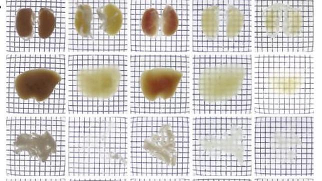 El proceso consiste en introducir progresivamente a través de los vasos sanguíneos de los órganos de los ratones un cóctel de sustancias químicas, apodado CUBIC, que decolora con éxito la sangre.