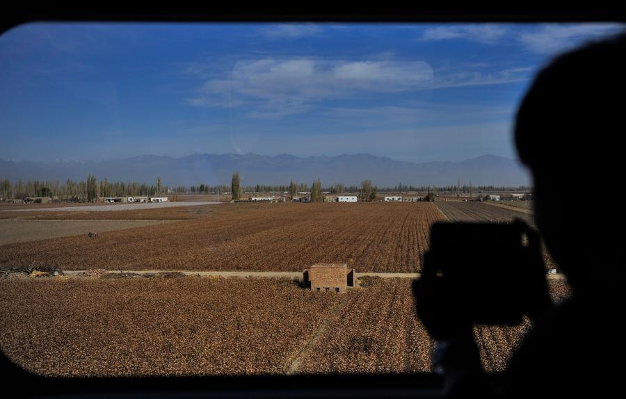 Una azafata toma una foto a través de una ventana del tren bala CRH5 es puesto a prueba en la región autónoma Uygur de Xinjiang, el 8 de noviembre de 2014.