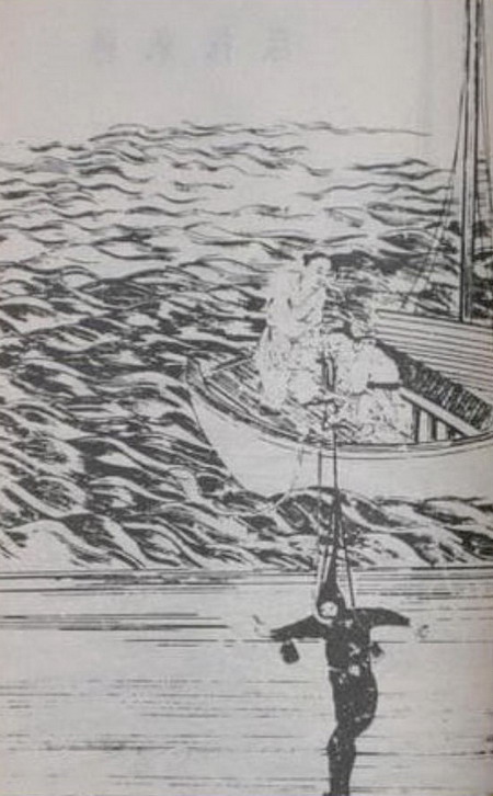 Un "traje de buceo" con dispositivos para abastecer de oxígeno al buzo durante la recolección de perlas. Se puede encontrarse en la obra Tiangong Kaiwu, una enciclopedia que abarca una amplia gama de cuestiones técnicas, publicada durante la dinastía Ming. [Foto: Xinhua]