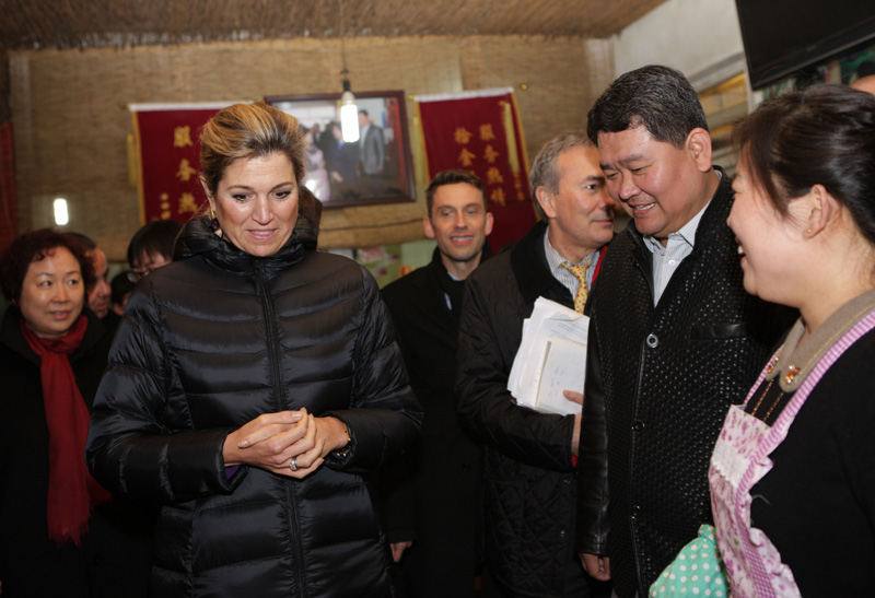 La reina Máxima de Holanda visita el restaurante de tallarines de la aldeana Wang Yan durante un viaje a una zona financiera en la aldea de Dongxingtun, a las afueras de Pekín, el 26 de noviembre de 2014. [Foto/CFP]