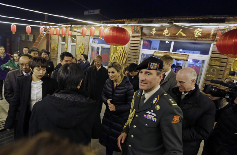 La reina Máxima de Holanda se despide en el restaurante de tallarines de la aldeana Wang Yan durante un viaje a una zona financiera en la aldea de Dongxingtun, a las afueras de Pekín, el 26 de noviembre de 2014. [Foto/CFP]