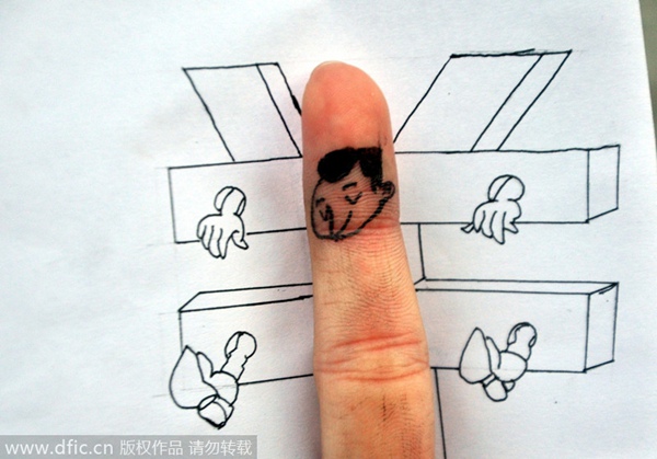 La obra “No alcanzo”, que representa un castigo por corrupción, fue hecha por estudiantes de la Universidad de Liaocheng, provincia de Shandong, el 4 dic. Hoy se celebra el primer Día de la Constitución en China. Diez estudiantes de la universidad crearon obras utilizando sus dedos para promover el Estado de Derecho. [Foto / IC]