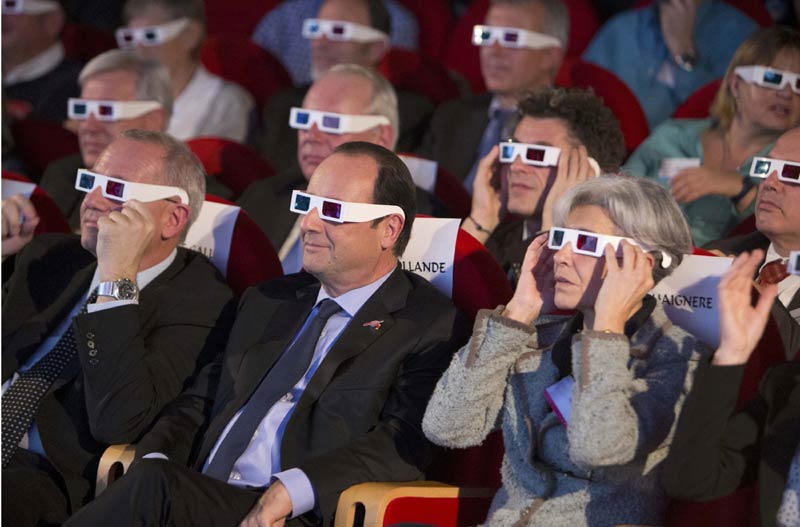 El presidente del Centro Nacional de Estudios Espaciales de Francia, Jean-Yves Le Gall (izquierda), el presidente francés, Francois Hollande (centro) y la antigua astronauta francesa Claudie Haigneré usar gafas 3D durante una visita a la Ciudad de las Ciencias de La Villette en París para presenciar el exitoso aterrizaje de la nave Philae en el cometa 67P / Churyumov-Gerasimenko, el 12 de noviembre de 2014.