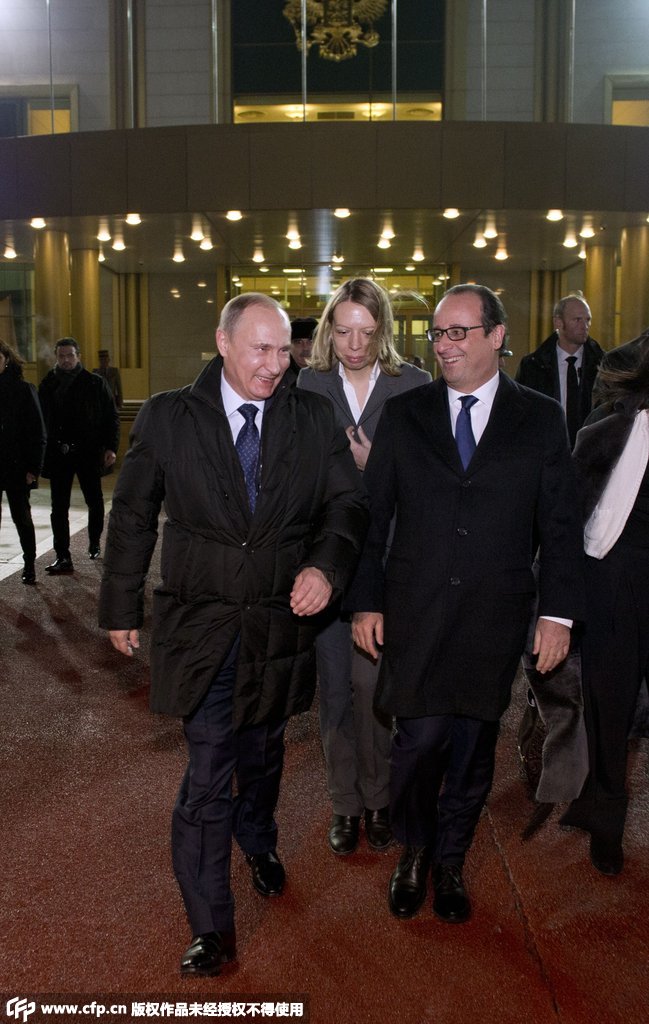 "Los problemas actuales son complicados, pero la discusión que tengamos aún da ciertos resultados positivos, y estoy seguro que su visita de hoy, aun siendo breve para una visita de trabajo, sin duda favorecerá la solución de muchos problemas", dijo Putin al iniciar la reunión con Hollande.