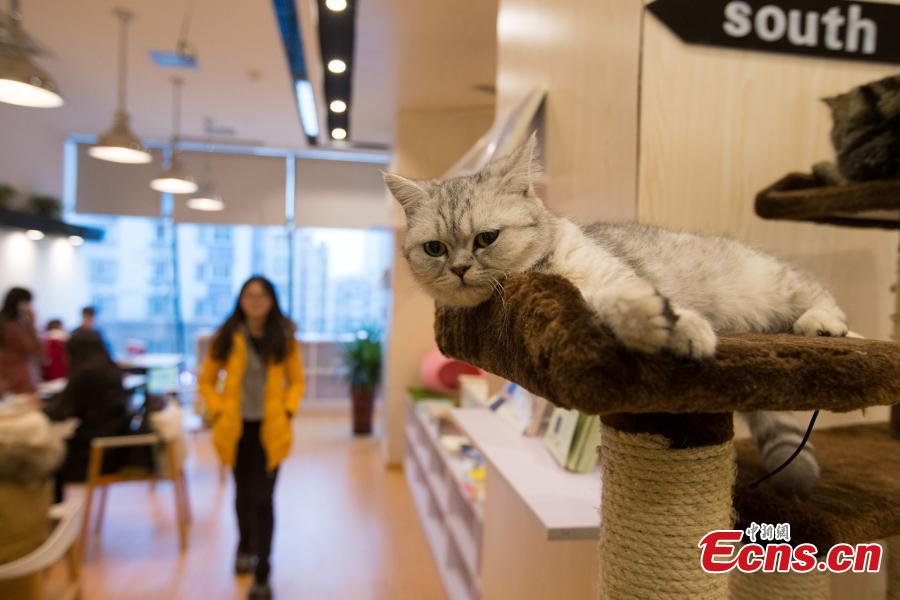 Un gato descansa sobre su silla en una librería en Nanjing, provincia de Jiangsu, el 4 de diciembre de 2014. La librería apertura recientemente es un buen lugar para los amantes del libro que también aman a los gatos. La librería especial es una empresa conjunta abierta entre la librería Xinhua y una cafetería de para amos con gatos. En esta tienda suele haber más de 20 gatos caminando entre los clientes.
