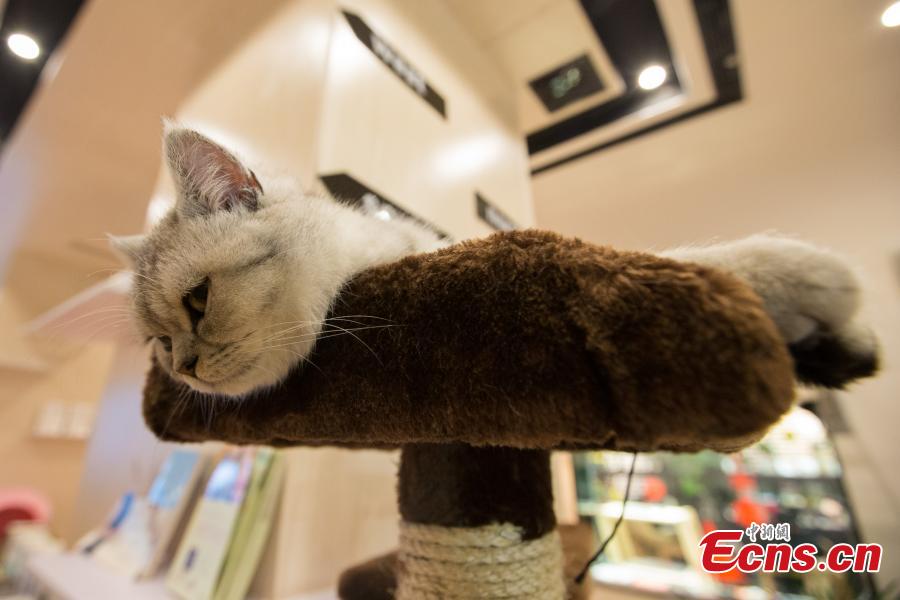 Un gato descansa sobre su silla en una librería en Nanjing, provincia de Jiangsu, el 4 de diciembre de 2014. La librería apertura recientemente es un buen lugar para los amantes del libro que también aman a los gatos. La librería especial es una empresa conjunta abierta entre la librería Xinhua y una cafetería de para amos con gatos. En esta tienda suele haber más de 20 gatos caminando entre los clientes.