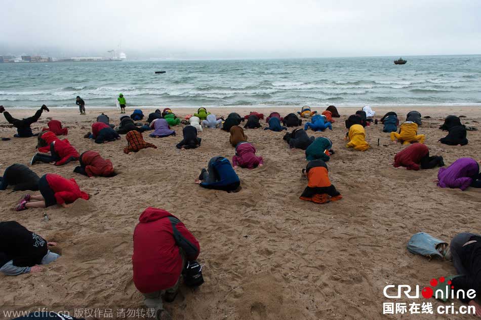 7 de diciembre, Wellington, Nueva Zelandia. Un hombre metió la cabeza bajo la arena en protesta por la inacción del gobierno frente al cambio climático.