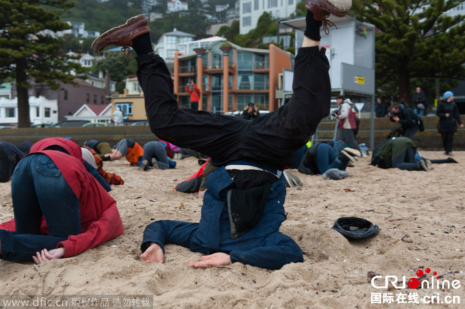 Pekín,08/12/2014(El Pueblo en Línea)-7 de diciembre, Wellington, Nueva Zelandia. Un hombre metió la cabeza bajo la arena en protesta por la inacción del gobierno frente al cambio climático.