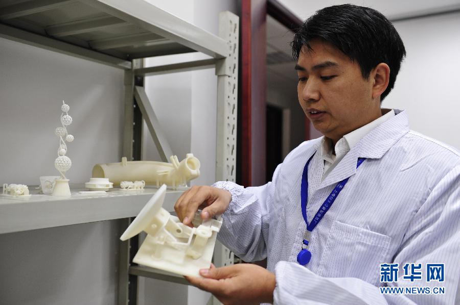 El día 7 de diciembre, Wang Lianfeng, ingeniero superior del Instituto de Tecnología Espacial de Shanghai, presenta los productos imprimidos con la impresora espacial 3D.