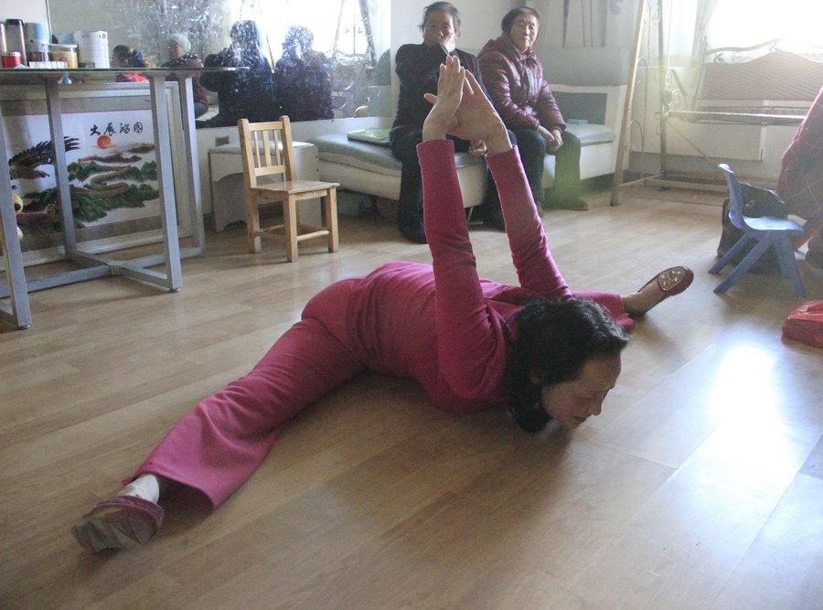 Una foto sin fecha muestra a Sun Jinzhi practicando diferentes posturas en una habitación.