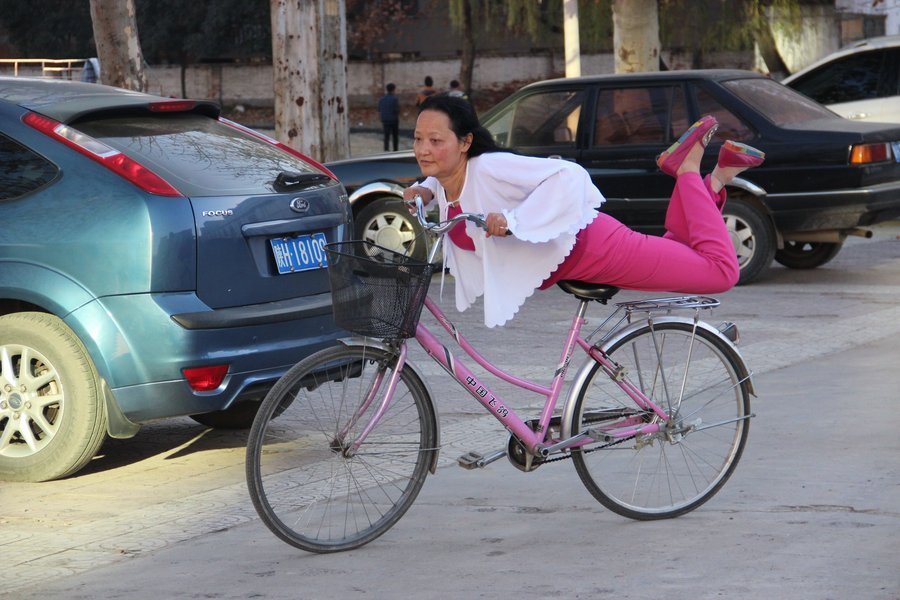 Pekín,09/12/2014(El Pueblo en Línea)-Una foto sin fecha muestra a Sun Jinzhi cambiando de postura sobre la bicicleta. Con una bicicleta, Sun, una se?ora de 50 a?os, intenta encontrar a su hijo, que desapareció hace siete a?os, cuando él tenía 27 a?os. Con el fin de encontrarlo, Sun practica diferentes trucos sobre su bicicleta todos los días para participar en “El Sue?o de China”, programa que podría estar viendo su hijo a través de la televisión y que propiciaría al reencuentro. Ese es el verdadero sue?o de Sun.