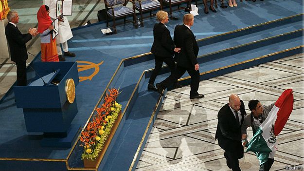 Oslo,Noruega,11/12/2014(El Pueblo en Línea)-La policía noruega está investigando la motivación del joven, cuya identidad no fue revelada y que fue detenido por los guardias de seguridad cuando trataba de subir al escenario, donde se encontraba una de las galardonadas con el Nobel de la Paz, Malala Yousafzai.