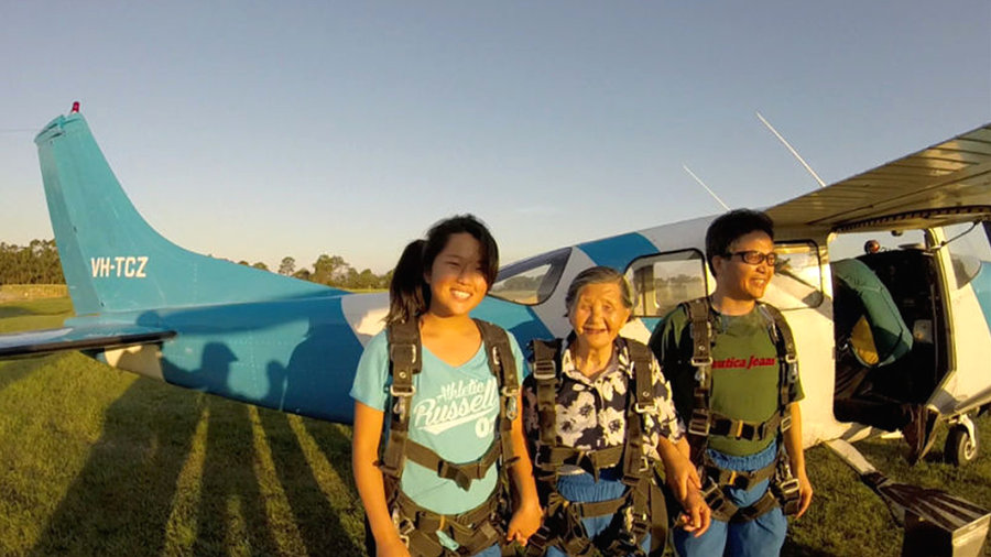 La abuela Min Deyun, de 81 a?os, durante una visita a la casa de su hijo en Australia se sintió atraída por el paracaidismo.