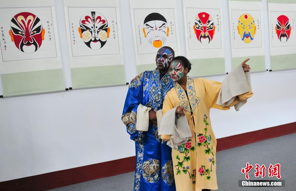 Dos jóvenes de la República del Congo, que estudian en la Universidad de Jinan, en Shandong, ensayan sus personajes antes de salir a escena.