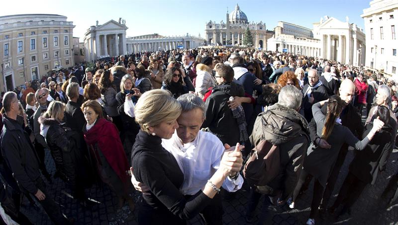 Luego, después de escuchar la catequesis del pontífice sobre la familia bajo un bello sol invernal y varios cantos en espa?ol, las notas de "Libertango" de Astor Piazzolla abrieron el baile desde la adyacente plaza Pío XII.