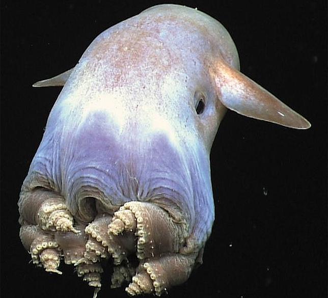 Este impresionante animal es un pulpo ?dumbo? del género Grimpoteuthis que fue fotografiado el pasado abril en el Golfo de México. Lo extraordinario de la imagen es la extra?a posición de los tentáculos, enrollados en una posición nunca antes vista. Los investigadores a bordo del buque estadounidense Okeanos Explorador consiguieron esta curiosa instantánea con un robot submarino a control remoto a una profundidad de unos 2.000 metros, según informa la revista Nature.