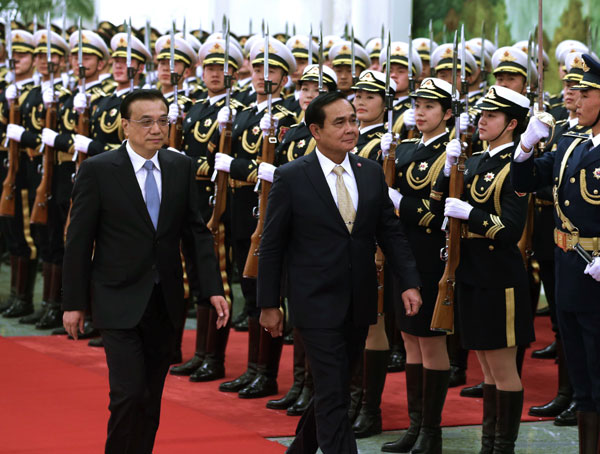 Primer Ministro, Li Keqiang y su homólogo tailandés Prayut Chan-o-cha durante la ceremonia de bienvenida. Los dos países firmaron cuatro acuerdos para impulsar los lazos económicos. Pekín, China.(Foto: Wu Zhiyi)