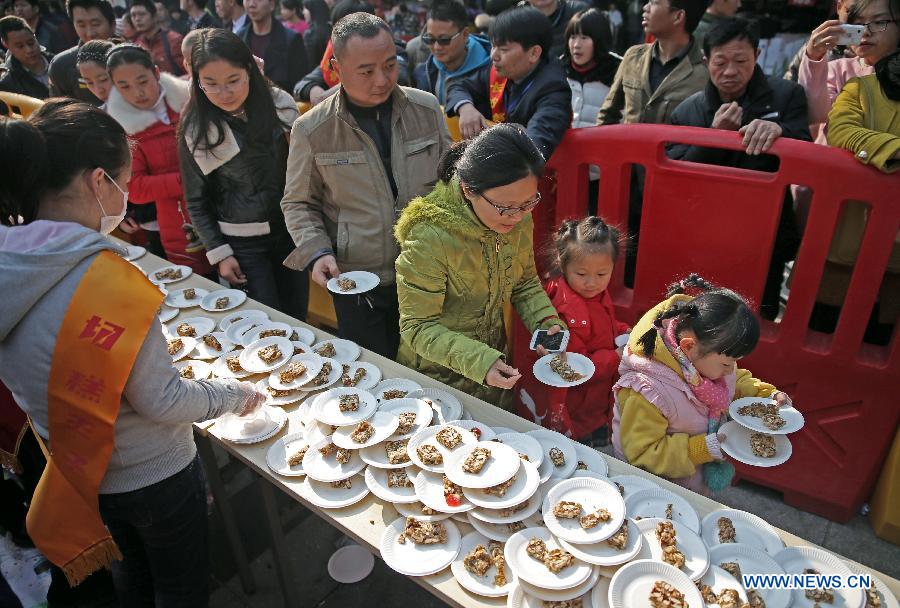 Gente de Changsha disfrutan de un enorme Qiegao (pastel de Xinjiang), durante un evento gastronómico al aire libre donde se ofreció pastel gratuito. Adil Memettur, Jiang Jinya y Jiang Chunyang presentaron un pastel de nuez de 2,6 metros de diámetro y 2015 kilogramos de peso, a consumir gratuitamente por todos con motivo del a?o nuevo. Adil Memettur, joven uygur, ha convertido la tradicional merienda de Xinjiang en un floreciente negocio en línea. Changsha, capital de la provincia de Hunan, 03 de enero de 2015.