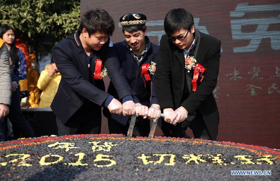 Adil Memettur (al centro), Jiang Jinya (izquierda) y Jiang Chunyang (derecha) confeccionaron un pastel de nuez de 2,6 metros de diámetro y 2015 kilogramos de peso, a consumir gratuitamente por todos con motivo del a?o nuevo. Adil Memettur, joven uygur, ha convertido la tradicional merienda de Xinjiang en un floreciente negocio en línea. Changsha, capital de la provincia de Hunan, 03 de enero de 2015.