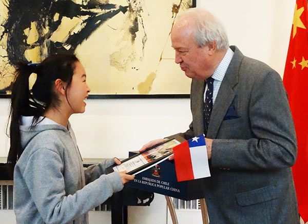 | Jorge Heine, embajador de Chile en China, entrega los diplomas de reconocimiento a los estudiantes de la secundaria Dayu. Pekín, China. |