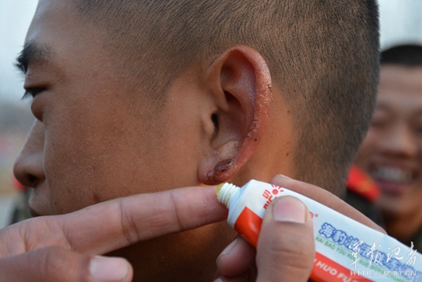 Aplican un ungüento en la oreja de un soldado para que cicatrice.