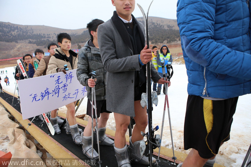 ?Quién necesita pantalones? Los esquiadores hombres intentan demostrar que los varones soportan más el frío que las mujeres. [Foto/IC]