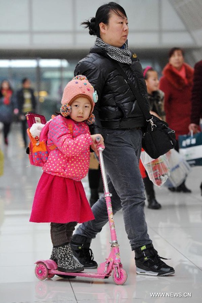 Una ni?a juega con su patín junto a su madre en la estación de Yinchuan, capital de región autónoma Hui de Ningxia, el 2 de febrero de 2015.