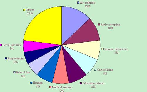 La encuesta fue publicada por el diario China Daily y participaron 3.886 internautas. En la lista, el problema de la contaminación ha ganado en importancia con respecto al a?o pasado.