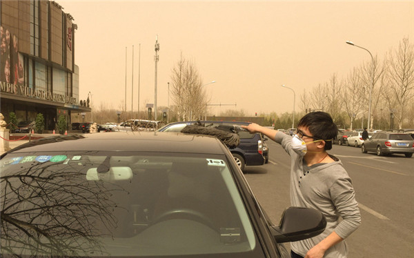 Un hombre con mascarilla retira el polvo de su coche durante la tormenta de arena en Pekín, el 28 de marzo de 2015.