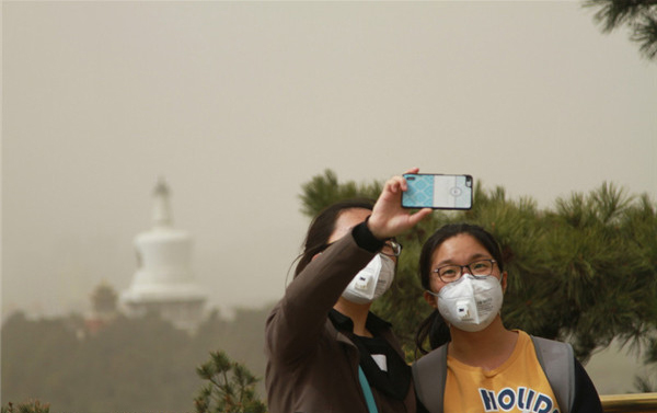 Los turistas con mascarilla se hacen un “selfie” en el parque Jingshan de Pekín, el 28 de marzo de 2015.