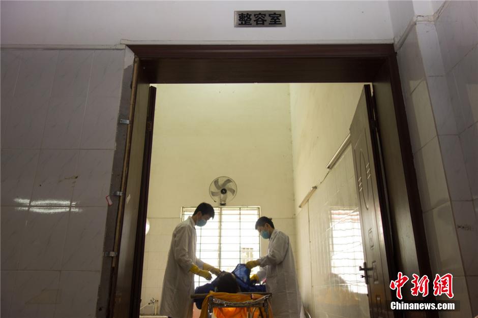 Dos artistas del maquillaje embellecen a un difunto. (Foto: Huang Weiming)