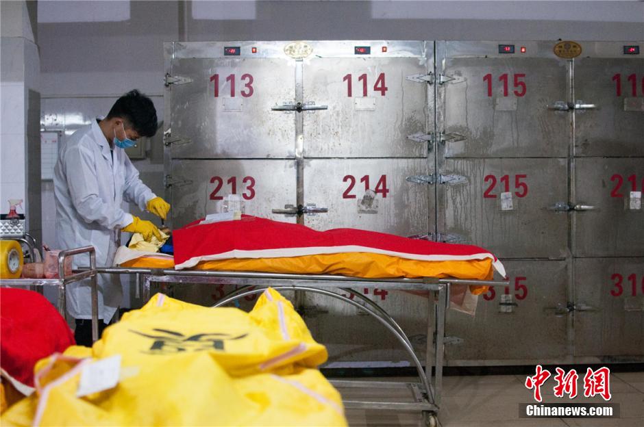 Dos artistas del maquillaje embellecen a un difunto. (Foto: Huang Weiming)