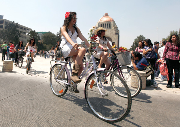 Varias mujeres montan en bicicletas por el centro de la Ciudad de México, el 3 de marzo de 2012. REUTERS/Tomas Bravo