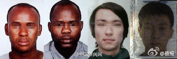 Arrestan a un presunto miembro de la banda “Freedom Fighters”, segundo de la derecha. La policía ha desarticulado una banda de narcotraficantes extranjeros que viven en Guangzhou, capital de Guangdong y se han producido 18 arrestos. Bautizados como "Freedom Fighters", esta banda se formó en 2009 y ha reclutado a más de 20 miembros hasta ahora. [Foto/Weibo]